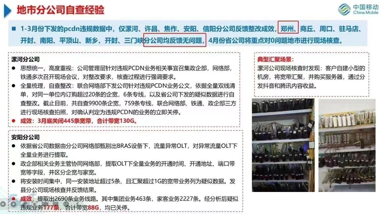 国内对PCDN的查处力度是一个地方一个样。有些运营商是完全不管,有的运营商是一刀切的管理,只要你上传流量大了就直接局停,比如河南移动,还有些地方会用技术手段限制,比如广东电信。