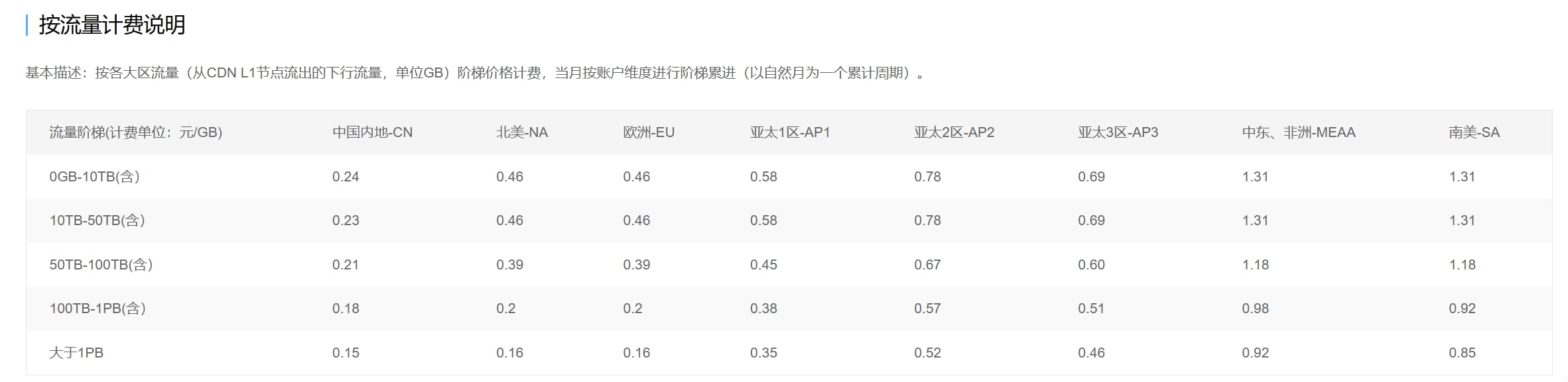 然后是国外的价格:Cloudflare,在不滥用的情况下你可以获得免费无限的流量。当然如果你非要找一个付费对象来比的话,这里也有。BUNNY.NET,基础套餐PB级可以低至0.002美刀,合人民币0.015元/GB,正好是阿里云的十分之一。